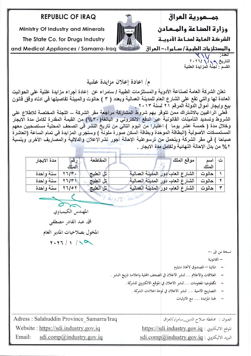 تعلن الشركه العامه لصناعه الادويه والمستلزمات الطبيه/سامراء عن ‘عاده اجراء مزايده علنيه على الحوانيت...